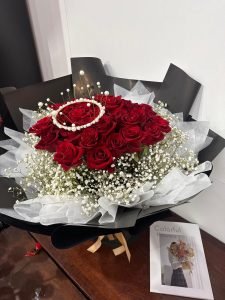 33 Red Roses with baby breath with pearl crown and fairy lights!