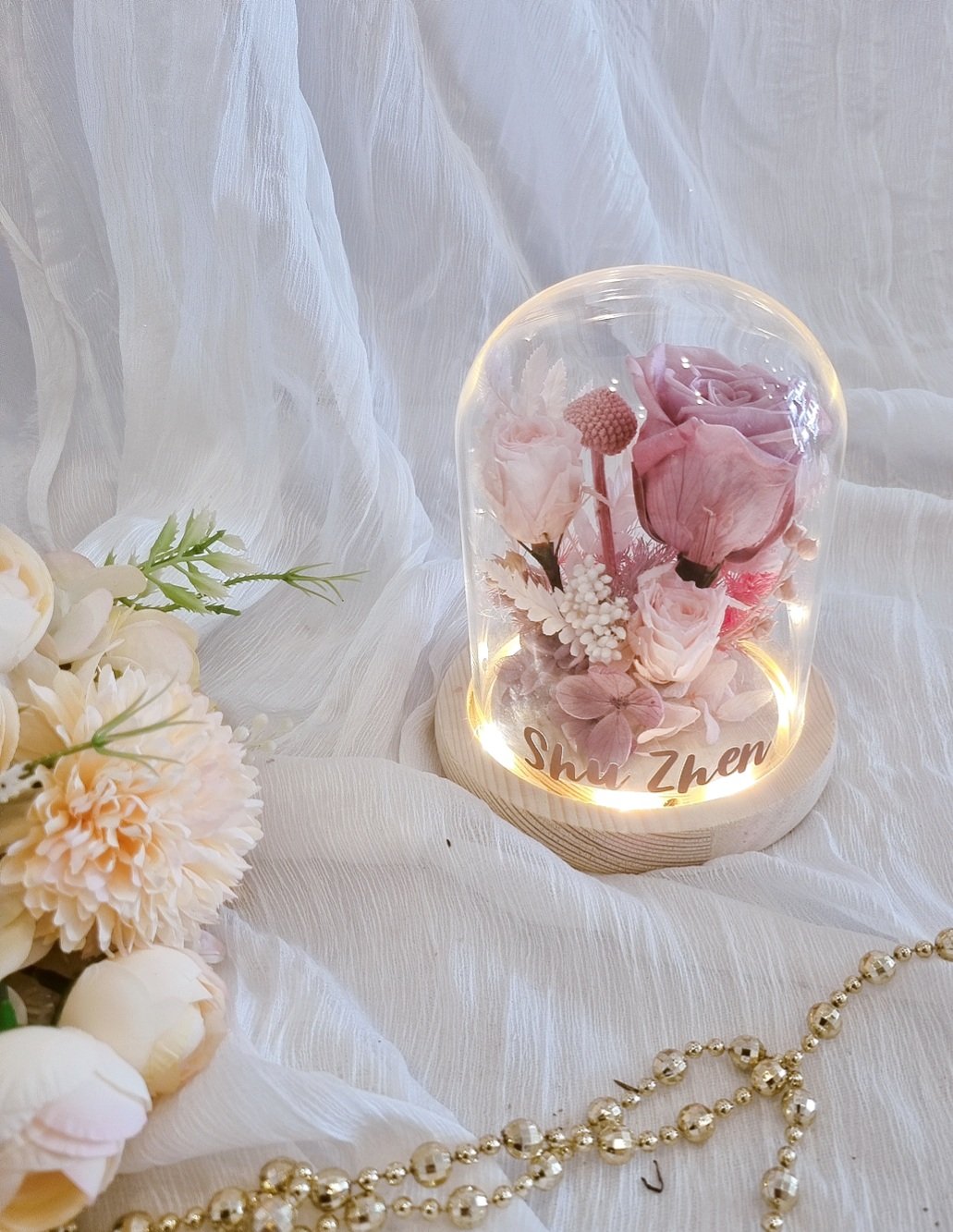 Crown your memories with this mementos of preserved flower dome that caught all the love you shared. Come pass it on to someone dear or let oneself enjoy this one and only creations transformed the softness of flowers into long lasting beauty.