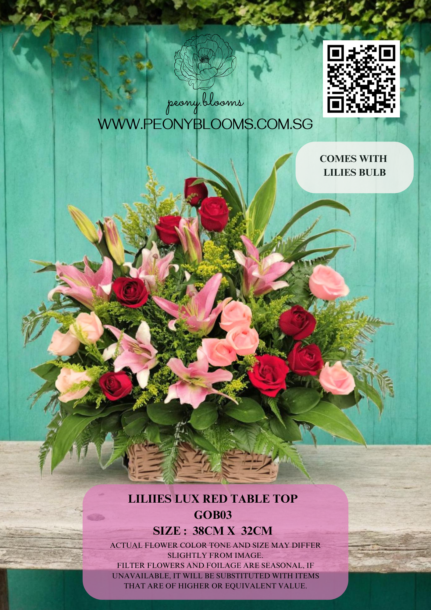 Filter flowers and foliage are seasonal, if unavailable, it will be substituted with items that are of higher or equivalent value.