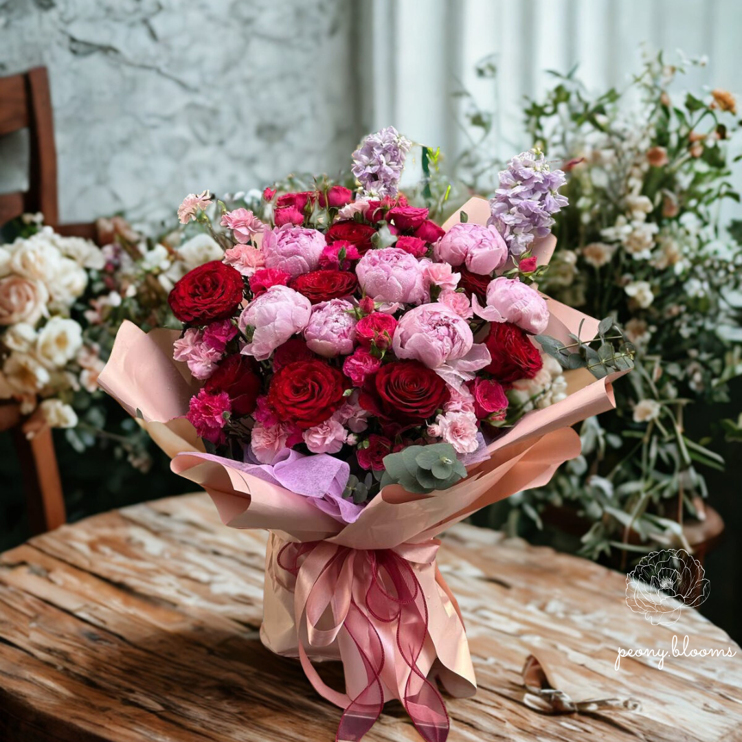 Luxury – 7 peonies with Premium Red Roses ( Photo )