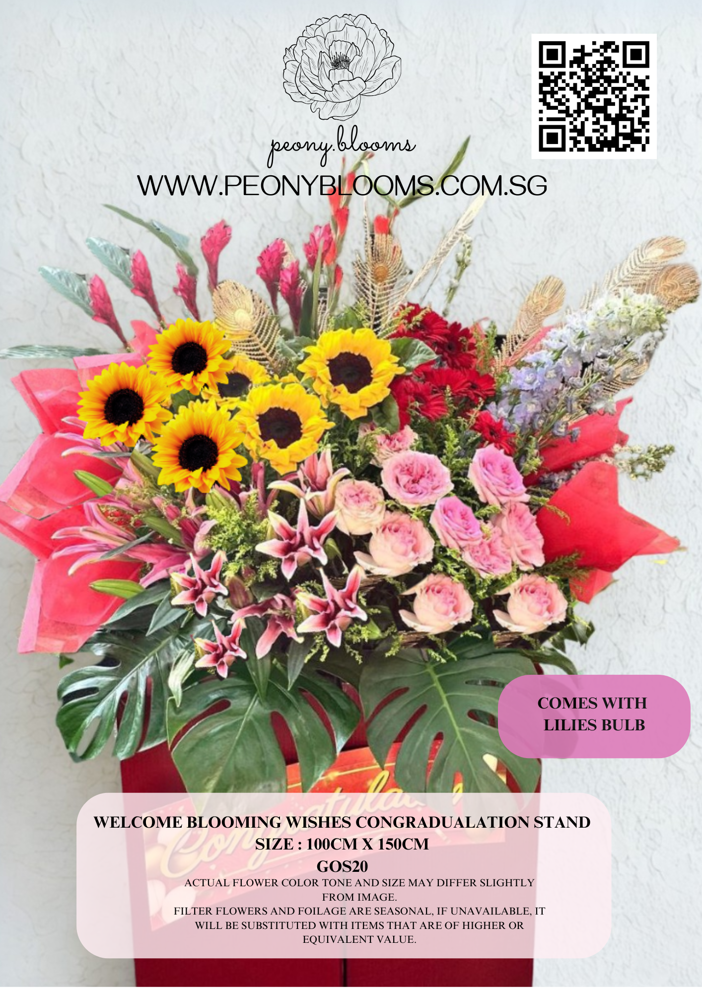 The congratulations flower stand is a grand and elegant floral arrangement designed to celebrate important milestones and achievements. The Welcome Blooming Wishes Congratulations Stand (GOS20) features a vibrant mix of sunflowers, Golden Phoenix roses, lily, delphinium, ginger flower, gladiolus, gerbera, and more filler flowers, creating a striking and luxurious display.